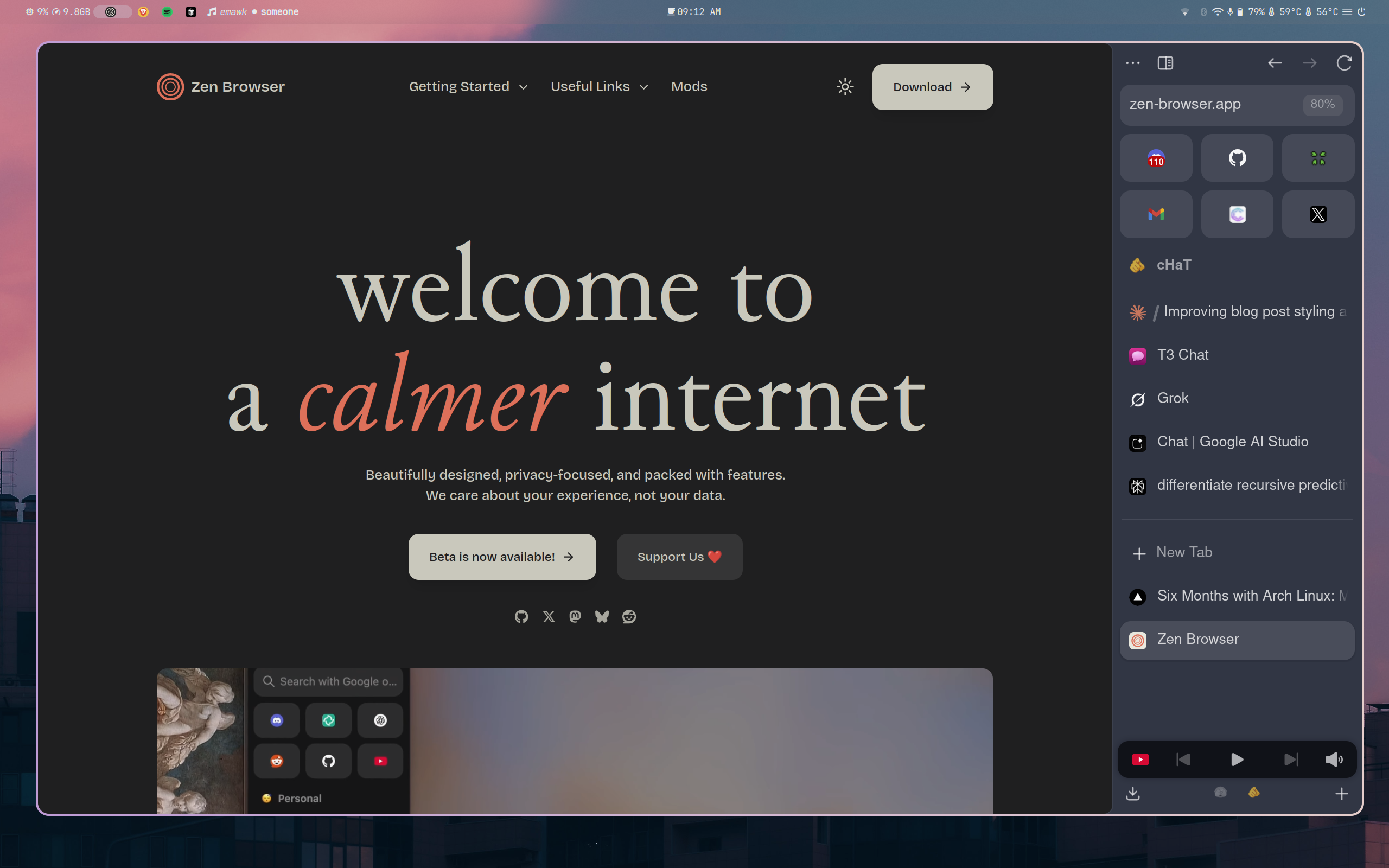 Oh, and music—I use Spotify with Spicetify and an ad-blocker JS extension. Free Spotify, zero ads. It's glorious. Works perfectly on Linux too, which was a pleasant surprise. And I'ts super consumizable with the Spicetify theme engine.